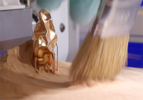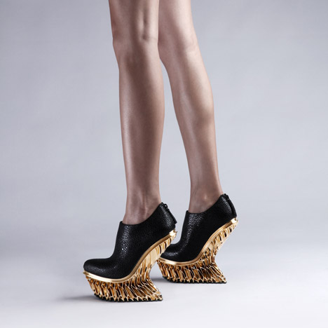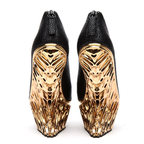 纽约设计师Francis Bitonti为荷兰著名鞋履品牌United Nude设计了一款3D打印的镀金异形鞋,其鞋跟部分可以依据顾客审美需求实现定制。