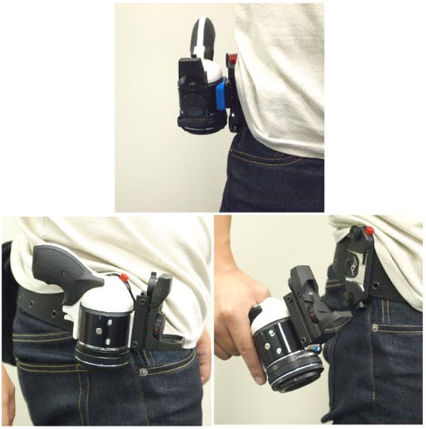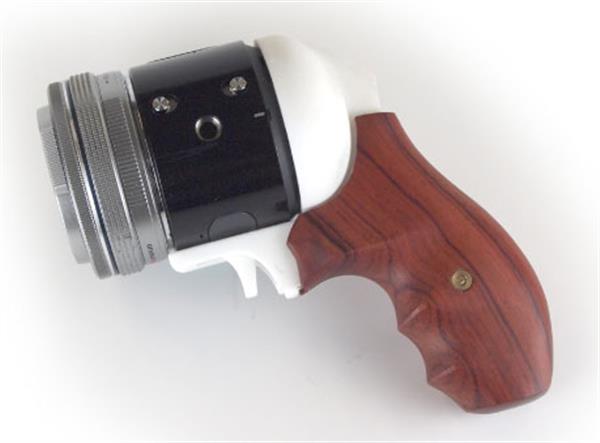 如今,有了3D打印手握式枪把设计,用户能够摆出类似射击的姿势进行拍摄,只需扣动枪把手上的“扳机”,即可触发快门拍出照片。让拍照体验轻轻松松和手软说拜拜!另外,这个握把和没有取景器的Olympus Air相机可谓绝配——它能够让用户不用看任何取景器就能把镜头对准拍摄对象,拍摄更灵活随心。看看下图的佩戴使用示意图,是不是很方便很显帅气?