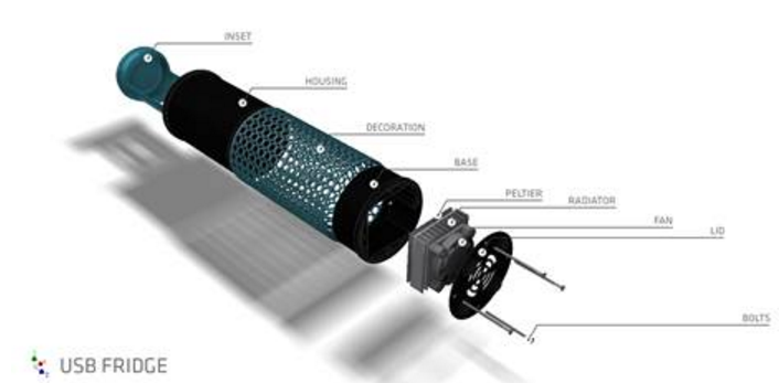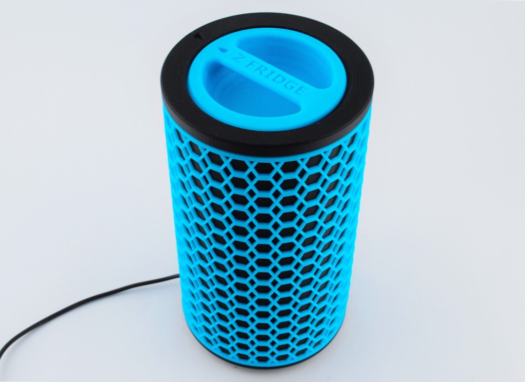 Z-Fridge是一个独立的“饮料调温箱”,能在你休息的片刻帮你加热或者冷冻饮料,而且这一操作只需通过连接UBS接口控制即可实现。这款产品制作采用黑色和天蓝色Z-ABS耗材,Konrad用了将近75小时打印出外部构造,并将其与散热器等内部零件结合起来。