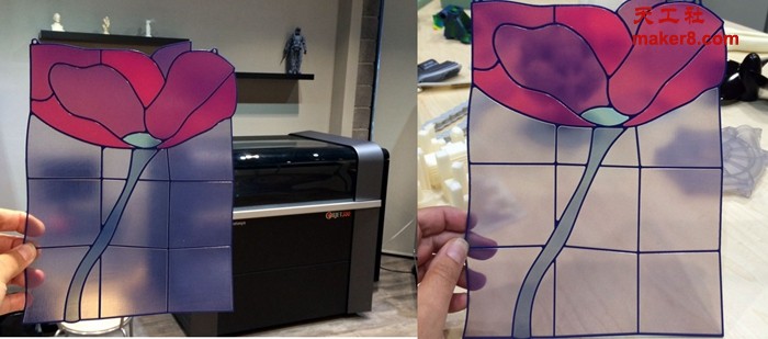 当3D打印机准备好后,他们开始了模型的制作。正如你从图片中看到的那样,打印的结果相当不错,看上去就像一块真正的带雾状效果的彩色玻璃艺术品!
