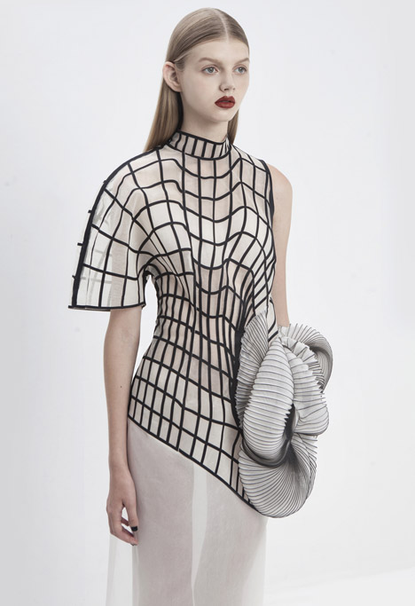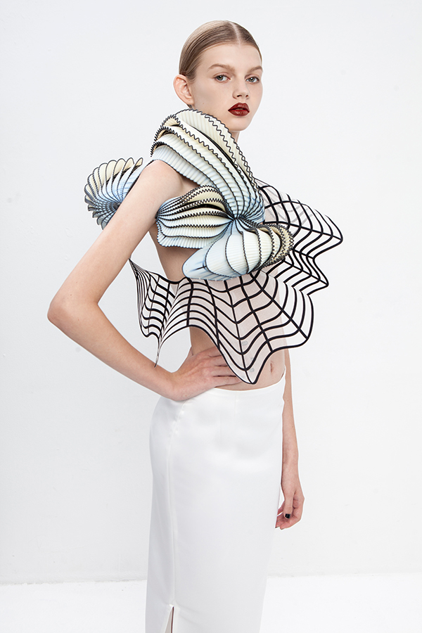 “虽然使用的是3D软件,但我被2D屏幕上那些不断重复的黑色线条组成的格格给迷住了,这些格格给人以及其繁复的感觉。我把这些线条用服装的纹路来表达,试图创造出一种错觉。”
