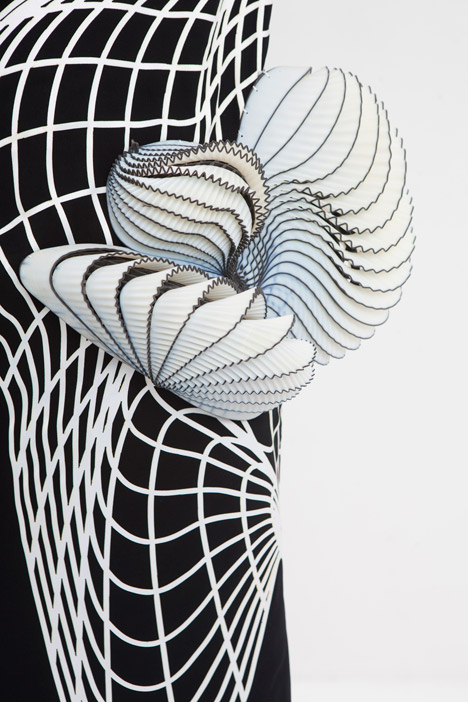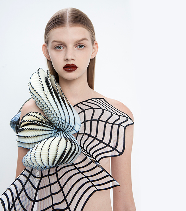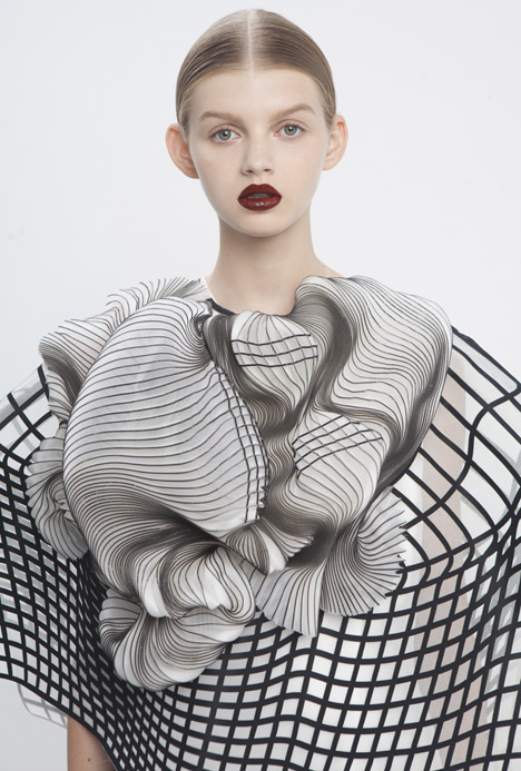 在Raviv设计的一些服装上,您很难把布料上的图案与立体的3D形状区分开来。在这里,模特本身的身体特征完全被具有强大立体空间张力的服装所掩盖,这个瘦女人几乎成了背景,而服装仿佛有了自己的生命,张扬地展现着自己的曲线与图案。