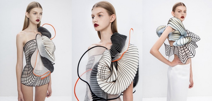 她最近在忙着筹备毕业设计作品展览,这次展览的主题是融合了3D打印元素、复杂平面图案和变形的网格的一系列服装。这些时装的百褶风格仿佛伊丽莎白时代遗韵,与Dale Chihuly的玻璃艺术和绚丽裸鳃亚目热带鱼表面错综复杂花纹的交集。而且服装线条充满了雕塑感。 Raviv希望能够藉此探讨软、硬、数码和身体知觉的互动。