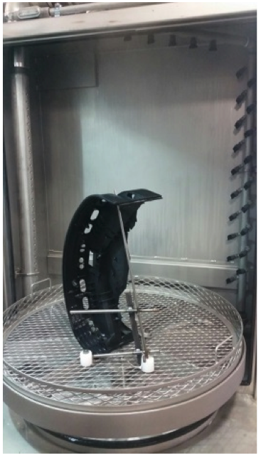 该新系统装有一个旋转转盘结构,上面有一个水箱会喷洒大量的溶液到零件上,零件在转盘上慢慢旋转而不至于浸泡在溶液里,大大缩短了干燥时间。