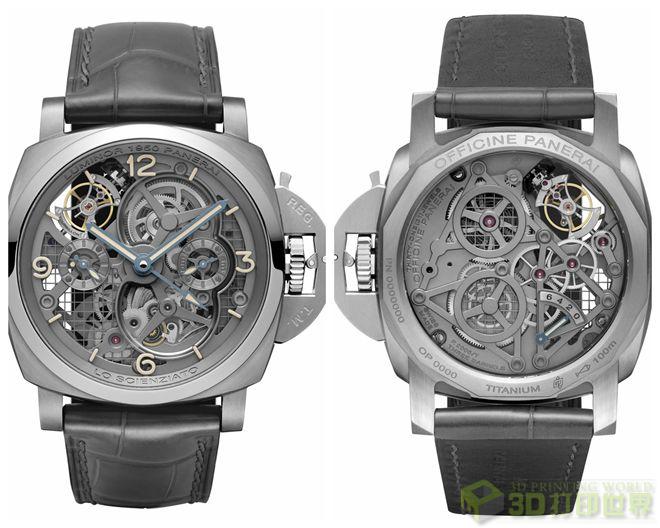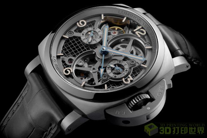 《3D打印世界》讯/ 在今年1月份的内瓦精细钟表展上,世界知名高级运动腕表品牌沛纳海(Panerai)推出了一款超级复杂的3D打印钛金属腕表Luminor1950 Tourbillon GMT Titanio。事实上,这也是全球首款使用钛金属3D打印的腕表,它是用直接金属激光烧结(DMLS)技术打造出来的。