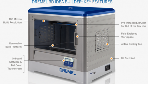 而去年9月份,Dremel公司也推出了自己的3D打印机Idea Builder,配置单头挤出机,打印层高为100微米,最大打印尺寸为230毫米×150毫米×140毫米;拥有3.5寸全彩IPS触摸屏,4GB内存。