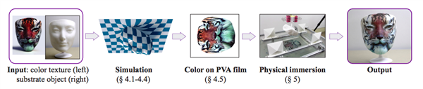 美国哥伦比亚大学及浙江大学的组合研究研究团队近日开发出一种解决方案,可以确保用户通过水转印将图案准确地印制在3D对象的表面。这一解决方法通过计算机将最终希望印制的3D对象表面效果拉伸成平面,然后将拉伸后的图案印制在薄膜上;随后用这个薄膜对3D对象进行水转印。