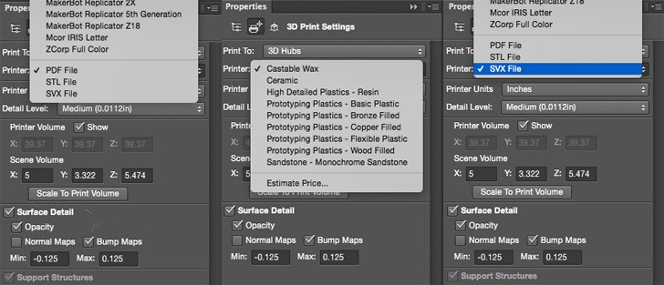 通过其Print to 3D PDF功能,3D打印用户可以将一个3D文件转换为3D PDF文件,整个过程就像将普通文档导出为PDF文件一样简单。在转换过程中,3D模型进入了Photoshop的3D打印处理管线,其间会经受错误检查以及修复过程,最后生成3D PDF文件。这就使用户、3D打印机制造商和3D打印服务商拥有将文件格式整合进自己的工作流程的能力。所以像3D Hubs这样的在线服务商能够允许用户上传自己的3D PDF文件进行3D打印。