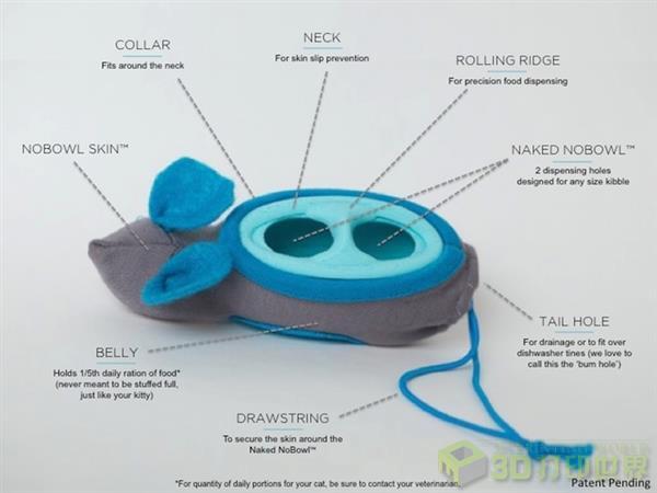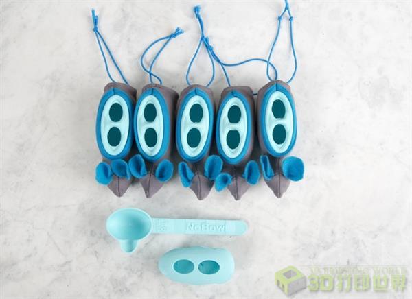 所以铲屎官怎么才能把傲娇的喵星人搂在怀里当萌宠,又保持它的心理健康呢?一家专门设计喵星人用品的公司F.E.E.D.(The Feline Environmental Enrichment Design Company)提出了解决方案,他们用3D打印打造了一个非常富有创意的猫猫喂食系统——NoBowl,其实很简单,就是打印出五只喂食的小碗,然后在外面包裹上老鼠形状的外皮,当然也可以是别的小动物,铲屎官就可以在碗里装上各种猫猫喜欢的食物,投放在房子或者花园的各个角落,关键是这些“小老鼠”在猫猫吃食的时候还会滚动。