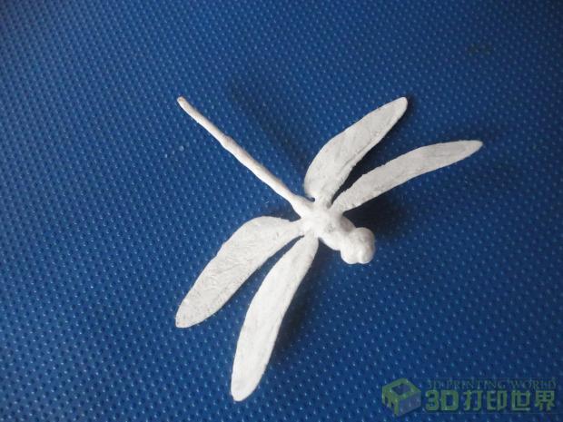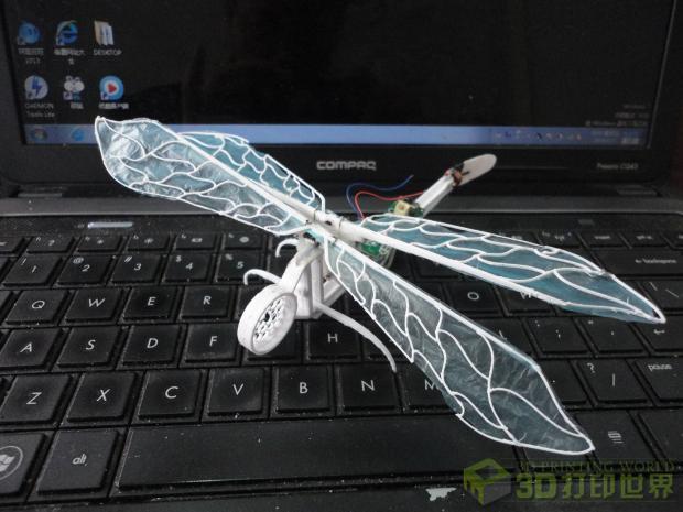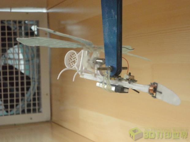 将上述3D打印的“蜻蜓”部件、动力和电子装备组装起来,并在”蜻蜓”翅脉上铺设0.1mm的聚乙烯塑料薄膜,一个遥控的机器“蜻蜓”便基本完成。完成后的机器“蜻蜓”总重15克,翼展15cm,身长16cm,高4cm。在加电和遥控下,蜻蜓的一对翅膀交互拍打,产升力和拉力;尾部的电磁舵可左右自如偏转,控制蜻蜓的航向。
