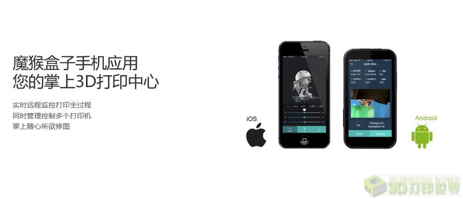 魔猴盒子是国内首个能够将市面上大部分打印机连入网络的控制工具。通过魔猴盒子硬件将打印机联网,用户能够通过app实现打印参数设定、打印过程监控、搜索附近3D打印机等一系列操作。用户在打印过程中能够通过摄像头实时监控过程,及时发现问题并进行调整。正式发布版本的魔猴盒子兼容reprap、makerbot、up!、闪铸、达芬奇及各种开源3D打印机,即插即用,实时控制。