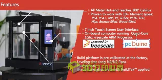 Raise3D的N系列3D打印机包括3款FDM打印机,在稳定性、精度、易用性以及材料兼容性上明显优于市面上的诸多产品。这几款产品可以可以兼容PLA、ABS、PC、TPU、HIPS、PETG等十多种材料,分别提供了满足不同用户需求的打印尺寸:N1打印尺寸 205×205×205mm,N2为305×305×305mm,N2+为305×305×610mm。