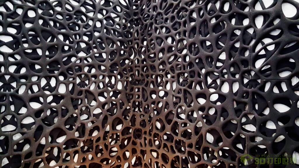 展位的制作采用了类喷墨技术,将具有沙子特征的材料打印成立体的结构板块。这类型的打印机通常用于3D打印汽车或航天航空的模型部件,但也可以用来制作艺术品和建筑模块。