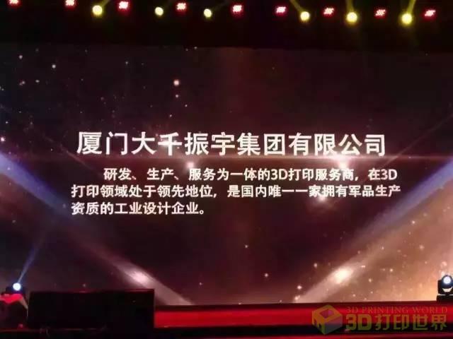 《3D打印世界》讯/ 2015年11月30日,由《领军企业家》杂志社主办的2015领军年会“领军之夜颁奖盛典”在北京饭店举行,1000余位行业领军企业管理者列席。颁奖晚宴上分别揭晓了2015年度领军企业最具投资价值奖、最具投资潜力奖、转型升级示范奖等重大奖项,大千振宇集团获2015年度领军企业最具投资潜力奖,大千振宇集团董事长巫国宝登台领奖。
