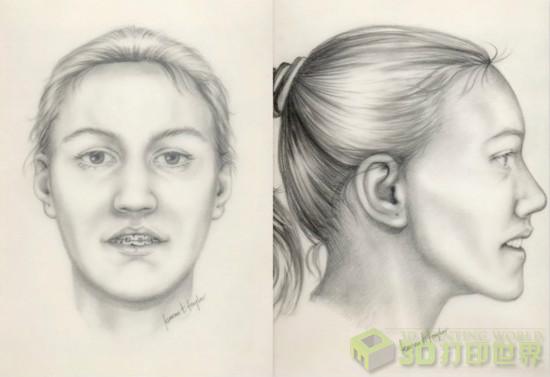 根据警方提供的包括头发样本在内的其它信息,Karen绘制出了下边死者正面以及侧面的二维头像,由于尸体旁边有一个绑头发用的橡皮筋,所以她在图像中绘制出了马尾辫。