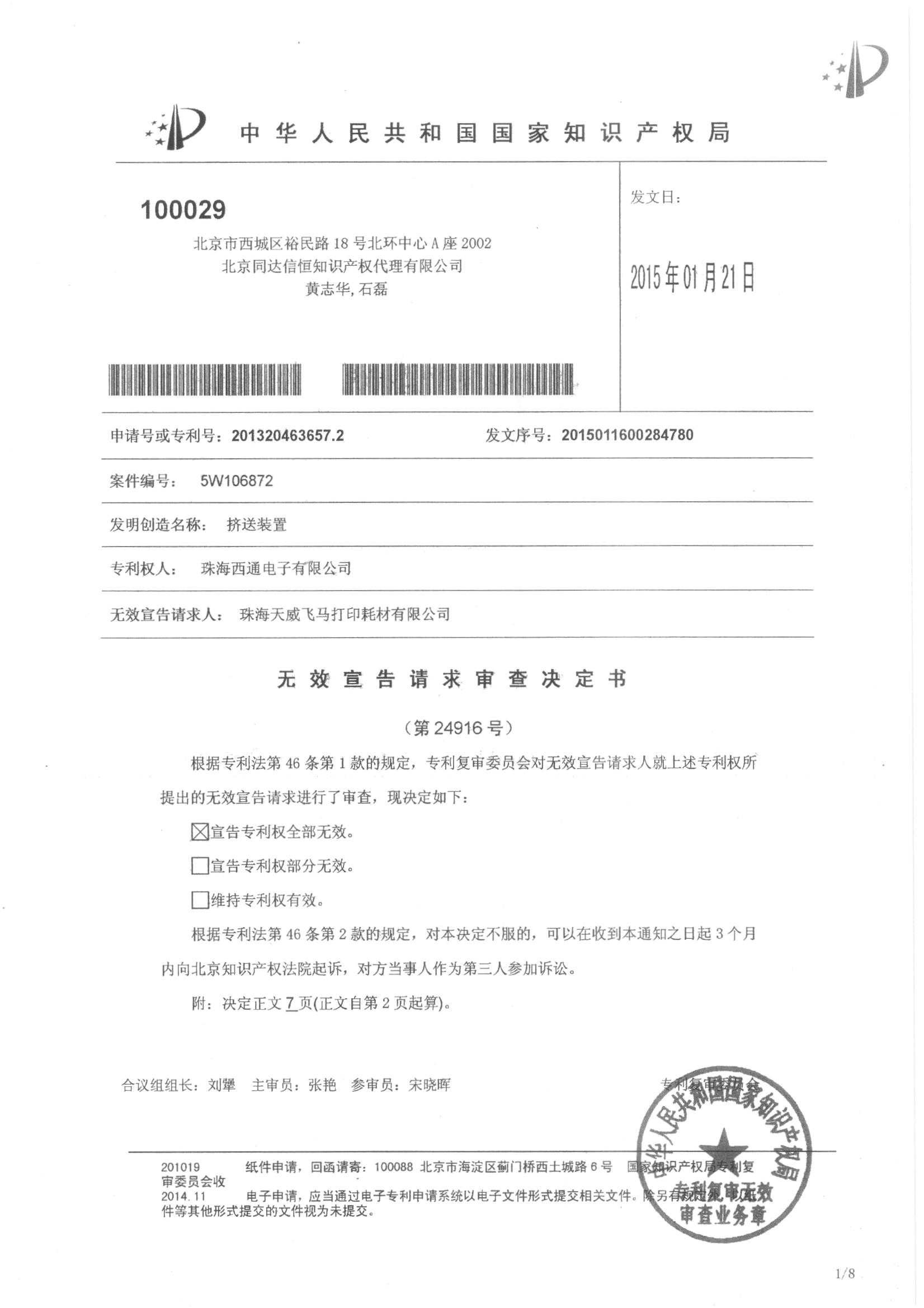 1月22日,珠海天威飞马打印耗材有限公司收到国家知识产权局宣告珠海西通电子有限公司3D打印机的挤送装置实用新型专利201320463657.2专利权全部无效的决定书。同日,该决定书已发送珠海市中级人民法院。