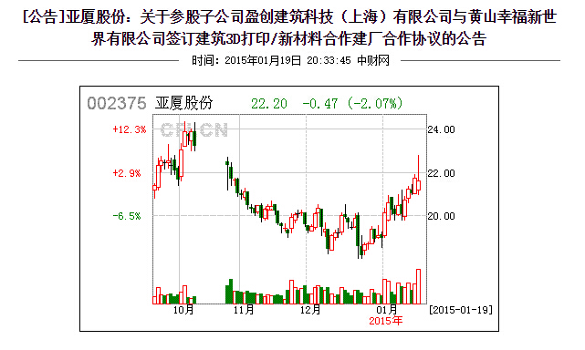 1月19日公告, 黄山幸福新世界有限公司(以下简称“黄山幸福”或“甲方”)于2015年1月18日与盈创建筑科技(上海)有限公司(以下简称“盈创科技”或“乙方”)签署《关于建筑3D打印/新材料合作建厂合作协议》。为了使乙方新材料和新技术在甲方所研发的项目上广泛应用,双方合作建设集生产、研发、展示、创意、销售于一体的“建筑3D打印梦工厂”。