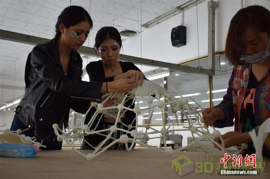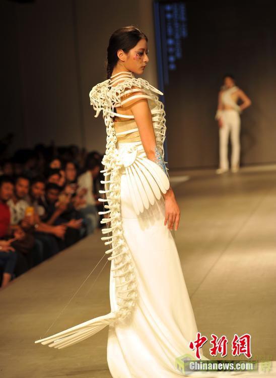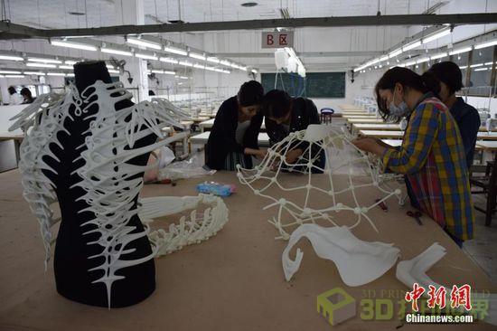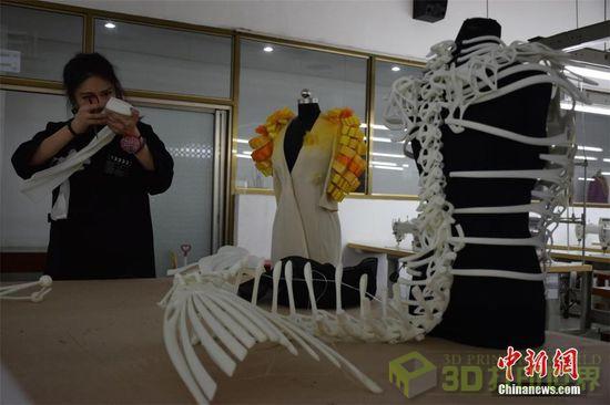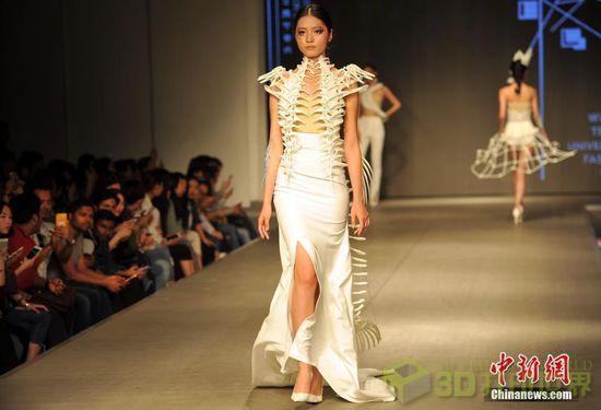 在武汉纺织大学服装与服饰设计专业毕业作品展上,3套用3D技术打印而成的服装作品一经亮相,引来不少关注。据设计者汤晓介绍,该服装以希腊神话故事里海妖Siren为灵感而创作,3D服装立体呈现出了海妖的骨骼结构。服装从设计到成型用时4个月,耗资5万余元。(图片来源:中新网)