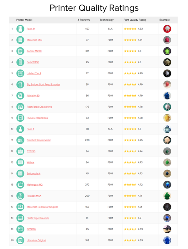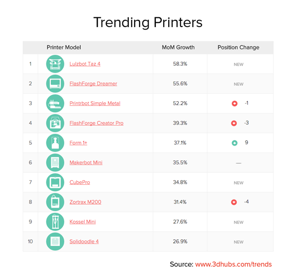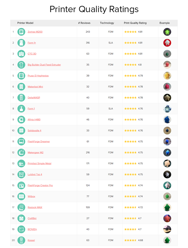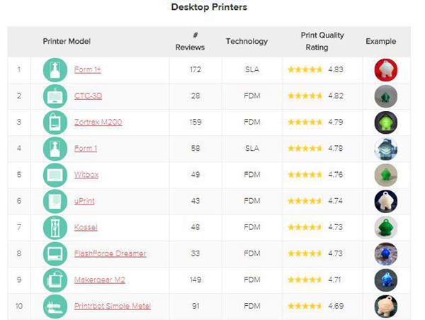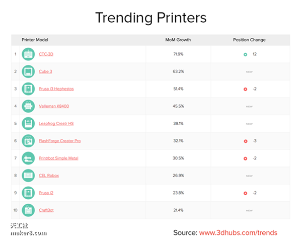 在最新五月报告中新榜单——3D打印机增长趋势榜上,来自中国珠海西通电子公司的CTC-3D打印机拿到了头把交椅,月度增长达72%。来自浙江的闪铸科技FlashForge Creator Pro 也增长32.1%排名第六。而在质量榜上Afinia H480、FlashForge Creator Pro、CTC-3D评分分别为4.79、4.78和4.74列全部机型第七、第八和第十二名。