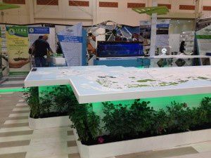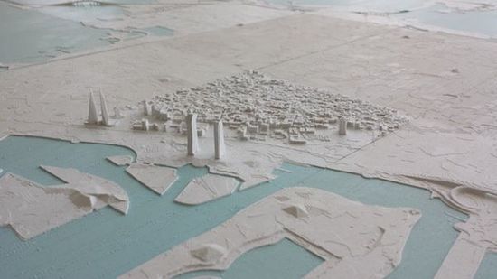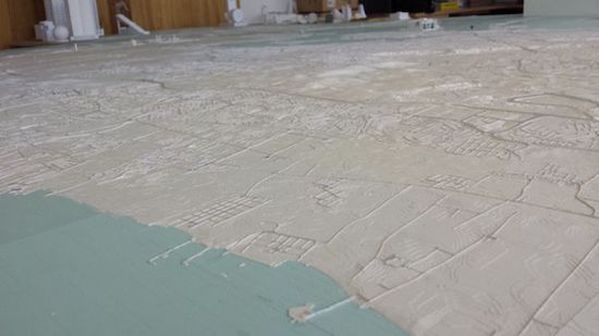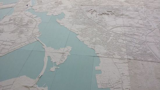 这个按1:10000的scale模型长5.4米,宽2.2米。建立这个模型,首先用mcor MCS的sliceit软件将数字地图模型打印成较小的部件,用3D打印机把整个巴林分解打印成各种小的部分,然后再将它们粘在一起。他们最后打印出灰色的纸条道路,把它们粘在地形上,使它们看起来稍微比道路更高,增加模型的真实性