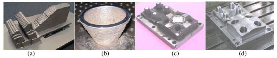 (一)通过基于金属线的LAM技术制成的沉积样品;(二)由混合层积制造(HLM)生产的厚壁结构;(三)近净成形的模具对;(四)HLM技术完成的模具对