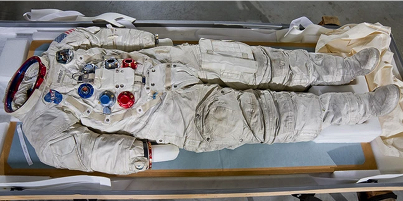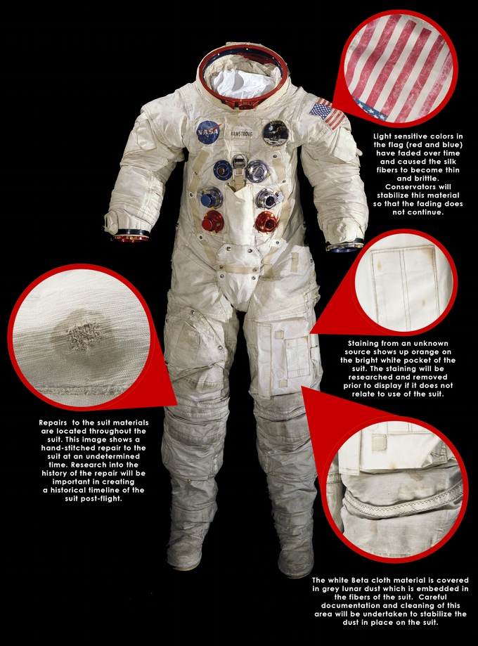 Phil Plait在当下正在美国航空航天博物馆进行的阿波罗11号展览上解释道,“完整的宇航服甚至没有展出过。这些宇航服都被放在一个特殊的装置里进行专门的保护,这包括当时阿姆斯特朗在月亮上行走时穿着的完整的太空服。这些年来他们为保存阿姆斯特朗的太空服所费不菲。但是现在的技术条件已经能够使其恢复到昔日的辉煌,数字化它,并向公众展览。”