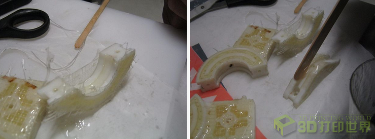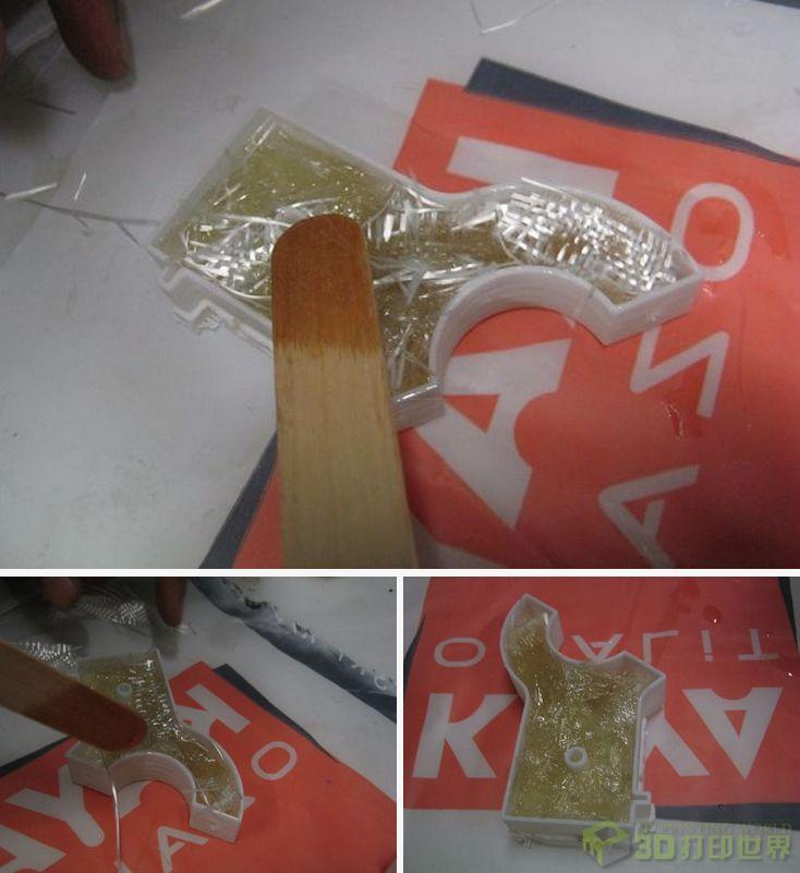 我们先用一些环氧树脂将两个打印好的部件合并浇铸在一起。等待凝固后,我们可以继续浇上更多的环氧树脂,直到玻璃纤维变得透明。