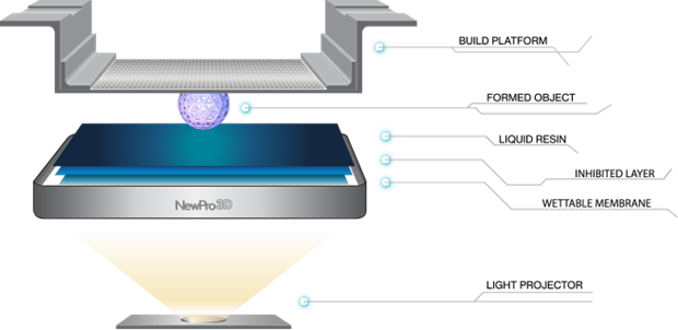 经过两年的研发,NewPro3D相信他们已经拿出了一种足以“彻底颠覆3D打印速度”技术。该公司发明的智能液体界面(Intelligent Liquid Interface,简称lLI)技术有点类似于DLP,它同样是基于光敏树脂的,不过将一个透明的膜加到了树脂与光源之间,其目的是创造一个“死区(dead zone)”。这就消除了在类似工艺中的机械复位,并允许对象以创纪录的速度“生长”。