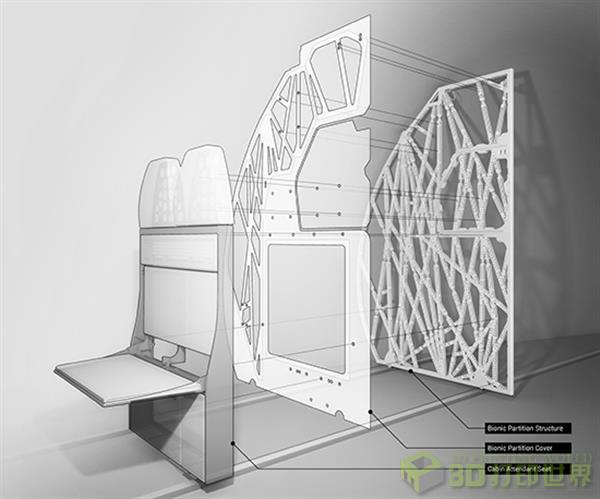 虽然如今在空客的飞机上3D打印的金属零部件已不鲜见,但是这还是首次将金属3D打印部件用于飞机机舱的设计。与现有的隔离结构相比,这种新型的仿生隔离结构由几个不同的部件组成,不仅强度更高,而且总量减轻了55磅。根据开发人员的计划,它将用于分隔客舱后部的厨房区域(见下图)。空客公司预计会在2016年初对这些仿生隔离结构进行测试,如果通过的话,它们会从明年开始被安装在每一架新制造的空客A320飞机上。
