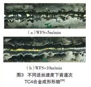 在基于TIG的堆焊成形过程中,熔滴向熔池过渡的稳定性对于成形质量至关重要,电弧挺度弱于激光、电子束等高能束,已堆焊沉积层形貌质量对下道次的堆焊表面影响较大,上一道次形貌特征在WAAM成形技术中表现出特定时、空非连续“遗传”特性,尤其是首道次成形,因基板的表面质量、清洁度、加工状态等不尽相同,因此首道次成形时应采用“强工艺规范”来弱化基板对成形质量的影响。图3对比分析了在大电流、相对较高的送丝速度下首道次TC4合金成形形貌特征,送丝速度WFS=10m/min时,首道次成形表面的“隆起”、“凹陷”缺陷较弱,成形宽度方向的波动性较低。基于“强工艺规范”的首道次成形时,因不必考虑熔池内熔融金属向两侧漫流,即重力对成形性的影响,向熔池内持续地高速率物质输入以弱化表面张力作用,使得成形体系成为以熔融态金属重力支配作用下的熔覆为主,可能会降低成形稳定性对基板特征的敏感程度而获得连续、稳定一致的成形形貌。
