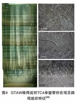 Wang等沿不同方向在TC4单壁成形件不同位置取样,并与锻件对比,评价沿成形方向及垂直于成形方向上成形件力学性能。在优化工艺参数下,虽然沿成形方向和垂直于成形方向抗拉强度存在一定差异,但强度差异并不显著。垂直于成形方向的塑性(沿柱状初生β晶粒方向)显著优于沿成形方向,比锻件高30%左右。在本课题组有关5A06铝合金电弧增材成形的性能研究中,获得了类似结论,成形件抗拉强度与锻件基本持平,但塑性显著提高。铝合金组织中并未出现图4中贯穿整个构件的宏观柱状组织,织构择优取向特征可能并非导致塑性提高的诱因,或许与成形过程中各层熔接特征相关,这一猜想有待进一步验证。增材制造最大的优势在于其复杂形状的构型能力,现阶段的研究工作主要聚焦于控形,而性能的研究仅限于表征其性能水平。成形过程受往复移动瞬时点热源的前热、后热作用,凝固织构的取向、分布、晶粒度等必然与成形的热物理过程相关,因此以温度场演变特征为契机,实现形性一体化控制是增材制造有别于传统减材、等材加工方法的技术优势。