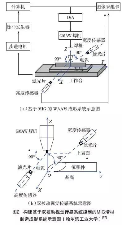 国内张广军等设计了一套用于焊道特征尺寸控制的双被动视觉传感系统,如图2所示,可同时获得熔敷层宽度和焊枪到熔敷层表面的高度图像,实现了熔敷层有效宽度、堆高等参数的在线准确检测,并以熔敷层有效宽度为被控变量,焊速为控制变量,设计了单神经元自学习PSD控制器,通过模拟仿真和干扰试验验证了控制器性能。参数自学习PSD控制器在熔敷层定高度、变高度控制中均可获得良好的控制效果,同时通过对熔敷层表面到焊枪喷嘴的距离进行监测和自适应控制,满足了WAAM成形稳定性的要求。